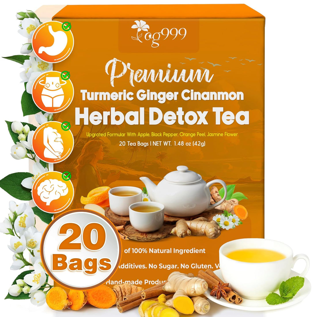 Premium Ginger, Turmeric and Cinnamon, Hand-made Blend of Ginger, Turmeric, Cinnamon, Orange Peel, Black Pepper, Hawthorn Berry and Jasmine.