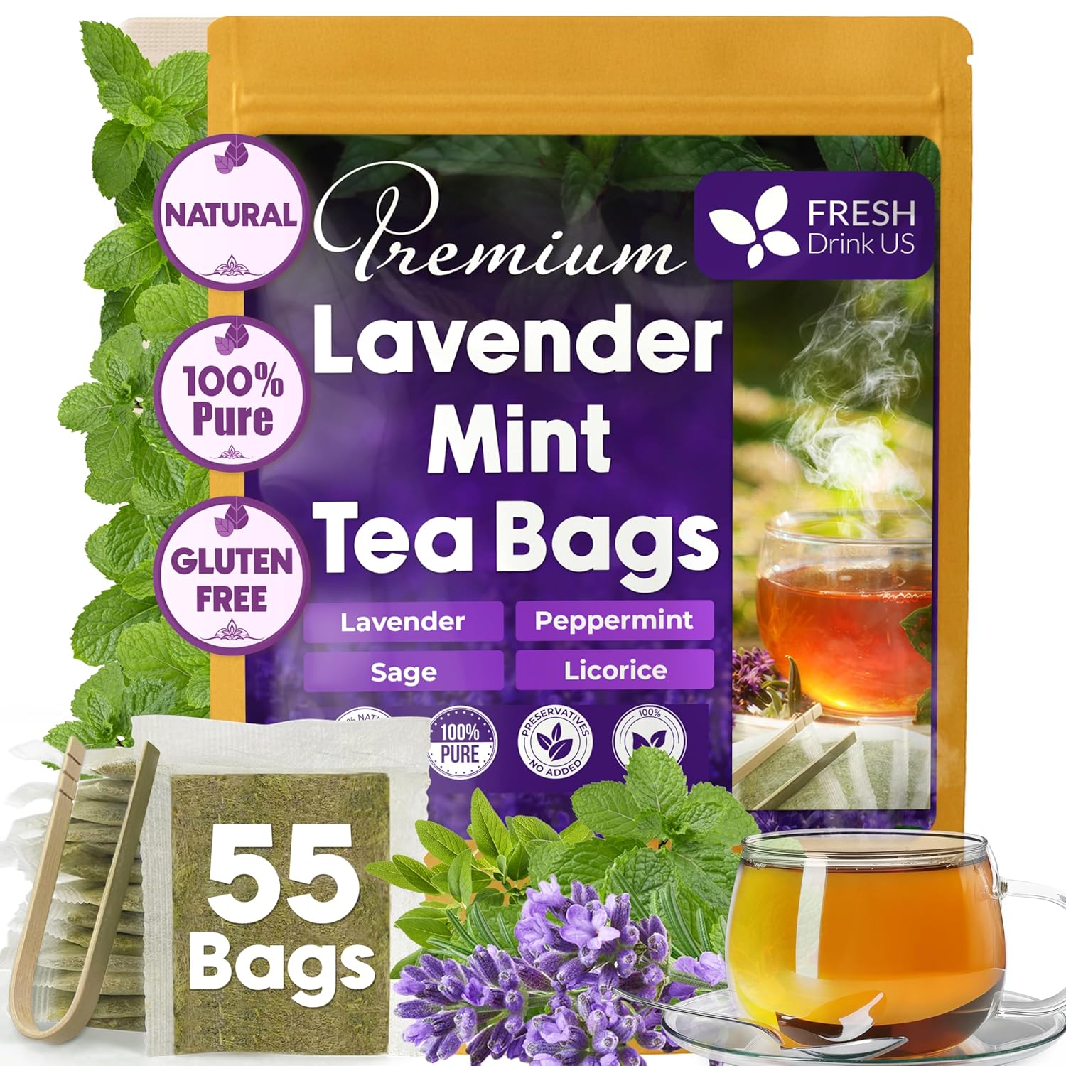Premium Lavender Mint Tea Bags. 100% Natural, Blend of Lavender, Peppermint, Sage and Licorice.